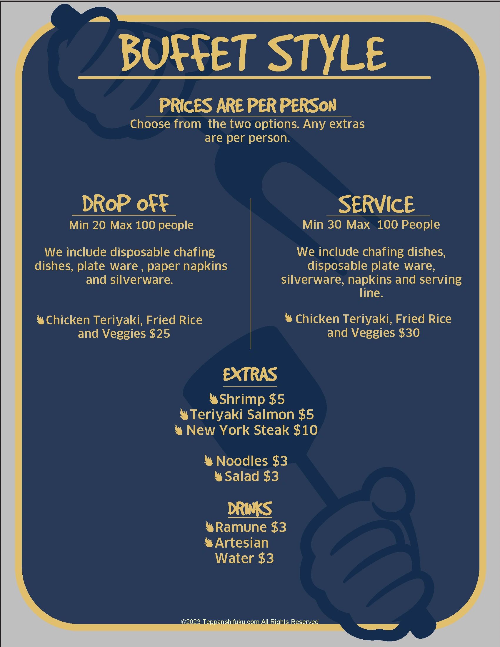 Fried rice, salad, veggies, homemade sauces, artesian water bottle, dessert & two entrees: