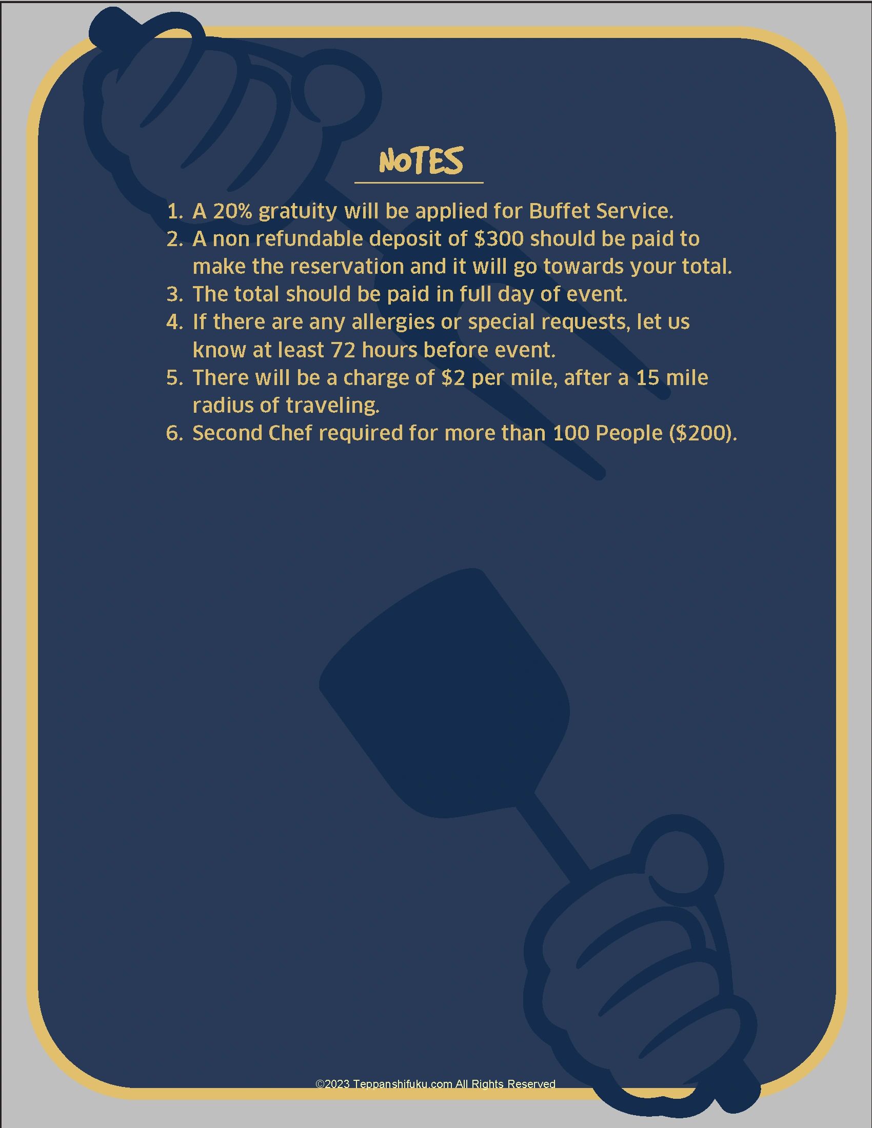 Appetizer, fried rice, salad, veggies, homemade sauces, artesian water bottle, choice of dessert & three entrees: